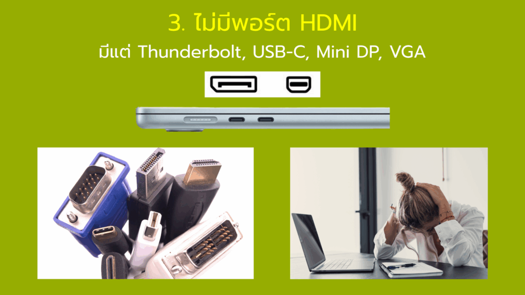 3.ไม่มีพอร์ต HDMI มีแต่ Thunderbolt, USB-C, Mini-DP หรือ VGA